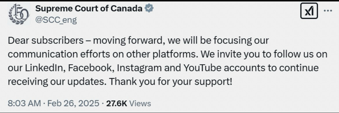 to transition official government communications away from X/Twitter to more secure, community-regulated platforms that prioritise public safety, accurate information, and accessibility. We encourage the government to explore publicly accountable alternatives, including decentralised networks, to ensure reliable and responsible communication with Canadians.