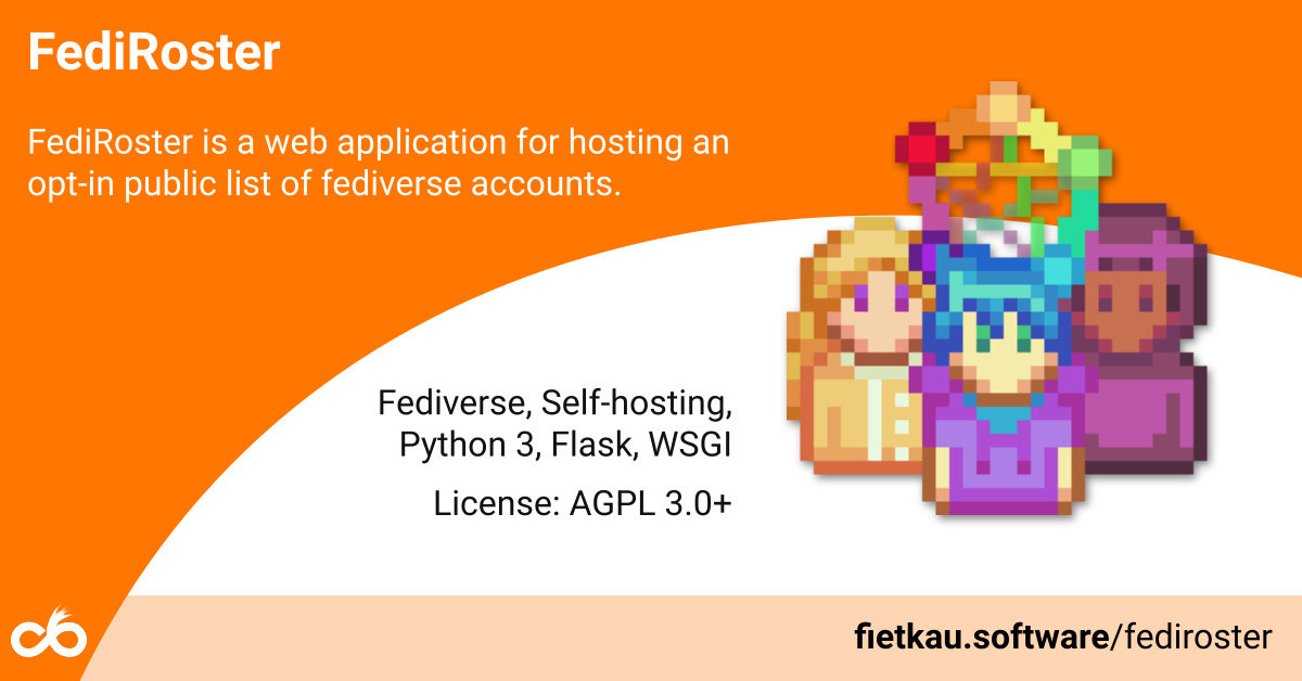 FediRoster is a web application for hosting an opt-in public list of fediverse accounts. Its purpose is to assist communities to more easily find people with shared interests on Mastodon and other connected platforms. People are able to add themselves to the list via proof of account ownership.